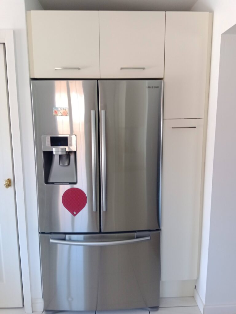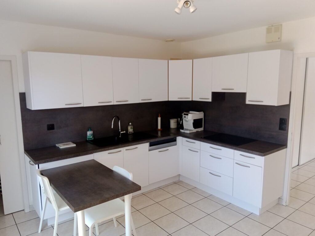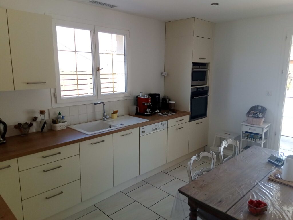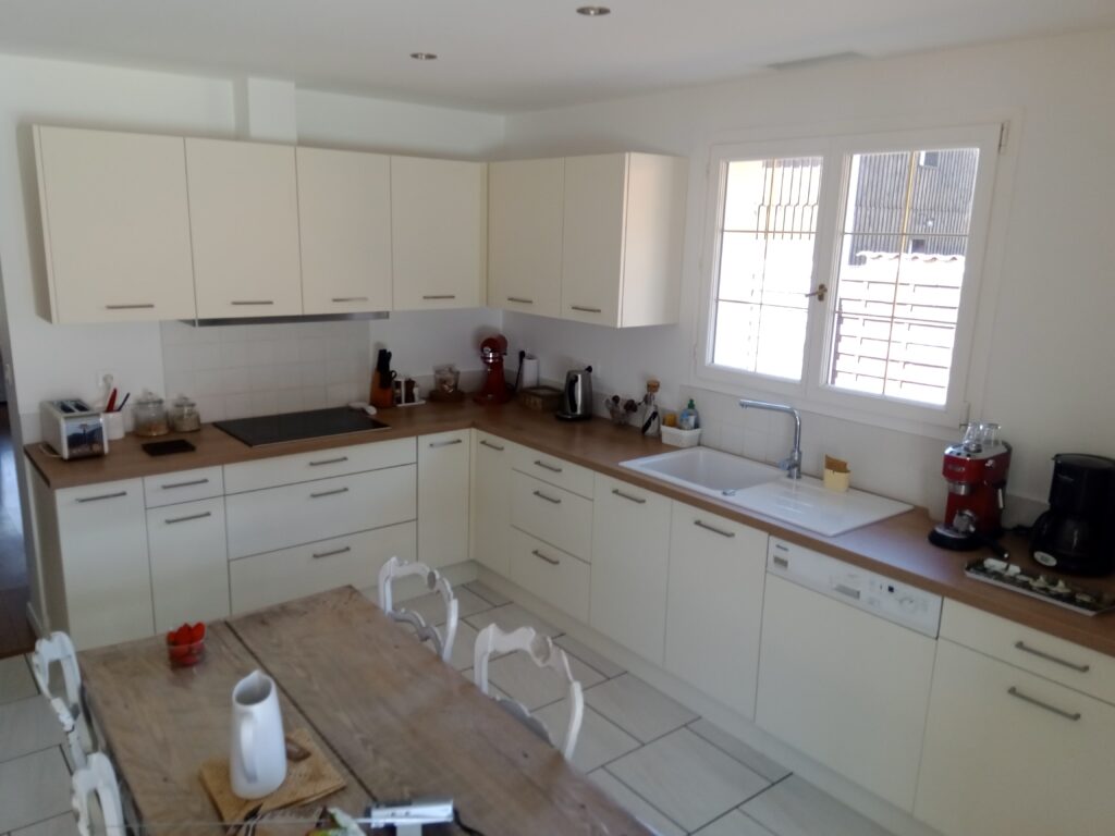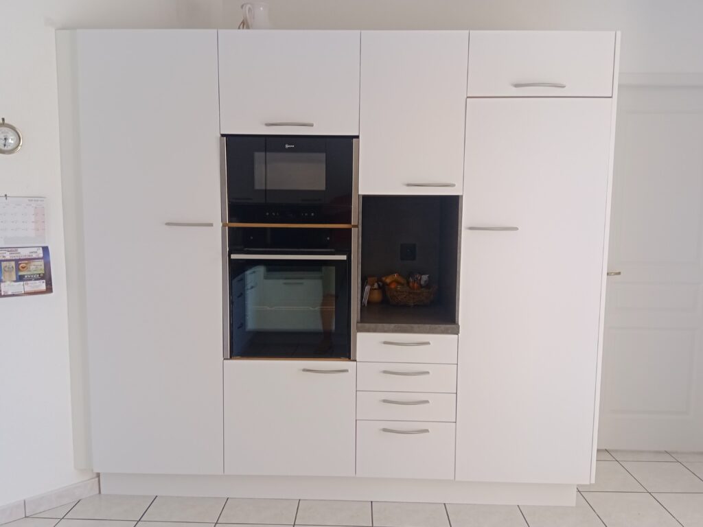 Changement complet des façades avec une finition Beige Magnolia élégante, démolition du mur en biais pour créer un plan de travail plus spacieux, et reprise en peinture de toute la pièce pour une rénovation harmonieuse.